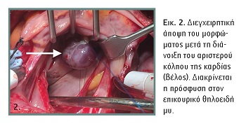 Ο ασθενής υποβλήθηκε σε καρδιοχειρουργική επέμβαση αφαίρεσης του όγκου με χρήση εξωσωματικής κυκλοφορίας και ήπια υποθερμία (ρινοφαρυγγική θερμοκρασία 34°C). Η προστασία του μυοκαρδίου εξασφαλίστηκε με χορήγηση ορθόδρομα ψυχρής κρυσταλλικής καρδιοπληγίας (Custodiol HTK). Ο χρόνος εξωσωματικής κυκλοφορίας ήταν 70 λεπτά και του αποκλεισμού της ανιούσας αορτής 52 λεπτά. Ο όγκος εντοπιζόταν στο χείλος της πρόσθιας επιφάνειας της μιτροειδούς βαλβίδας και ταυτόχρονα προσφυόταν στέρεα και στην κεφαλή επικουρικού θηλοειδούς μυός (accessory pappilary muscle) εντός της αριστερής κοιλίας (εικόνα 2). Μετά την αφαίρεση του όγκου διενεργήθηκε πλαστική αποκατάσταση των γλωχίνων της βαλβίδας και τοποθετήθηκε ειδικός δακτύλιος ενίσχυσης της επιδιορθωθείσας βαλβίδας (Edwards Physio II Ring 5200, Size 24 mm). Η παθολογοανατομική εξέταση του μορφώματος τεκμηρίωσε αγγειογενή αιματική κύστη (angiogenic blood cyst).
