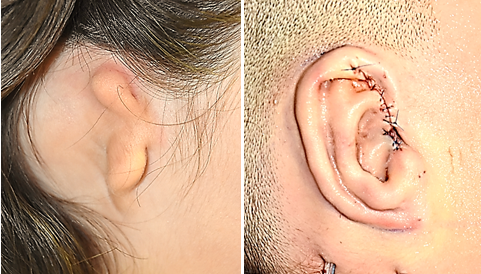 Εικ. 3, 4. Δεξιά μικρωτία και αποτέλεσμα αμέσως μετά την τοποθέτηση του χόνδρινου σκελετού κάτω από το δέρμα και την εφαρμογή αρνητικής πίεσης.