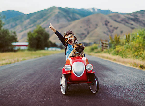 A young boy with flying goggles and flight cap races a red toy car with his pet and best friend French Bulldog along a small road in Utah, USA. Sometimes a road trip journey with your best friend and some fresh air in your face is the best medicine for the soul.
