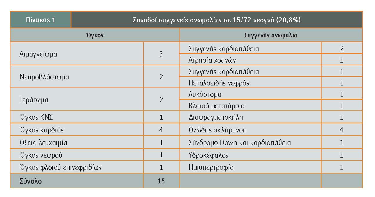Μεταξύ των παιδιών και εφήβων που προσβάλλονται από καρκίνο, 1,5%-2% αφορούν την ηλικία από τη γέννηση έως 12 μηνών με συχνότητα από 1:12.500 – 1:27.500 γεννήσεις. Πριν από τη γέννηση, ορισμένοι όγκοι διαπιστώνονται κατά την εμβρυϊκή ζωή με τον συστηματικό έλεγχο της εγκύου μητέρας, οπότε διαγιγνώσκονται αμέσως μετά τη γέννηση ή κατά τη νεογνική περίοδο (εντός του πρώτου μήνα της ζωής) (Moore). Είναι ενδιαφέρον (πίνακας 1) ότι στο 15%-20,8% έχει παρατηρηθεί εμφάνιση όγκου παράλληλα με τη διαπίστωση διάφορων συγγενών ανωμαλιών (Berbel-Tornero).