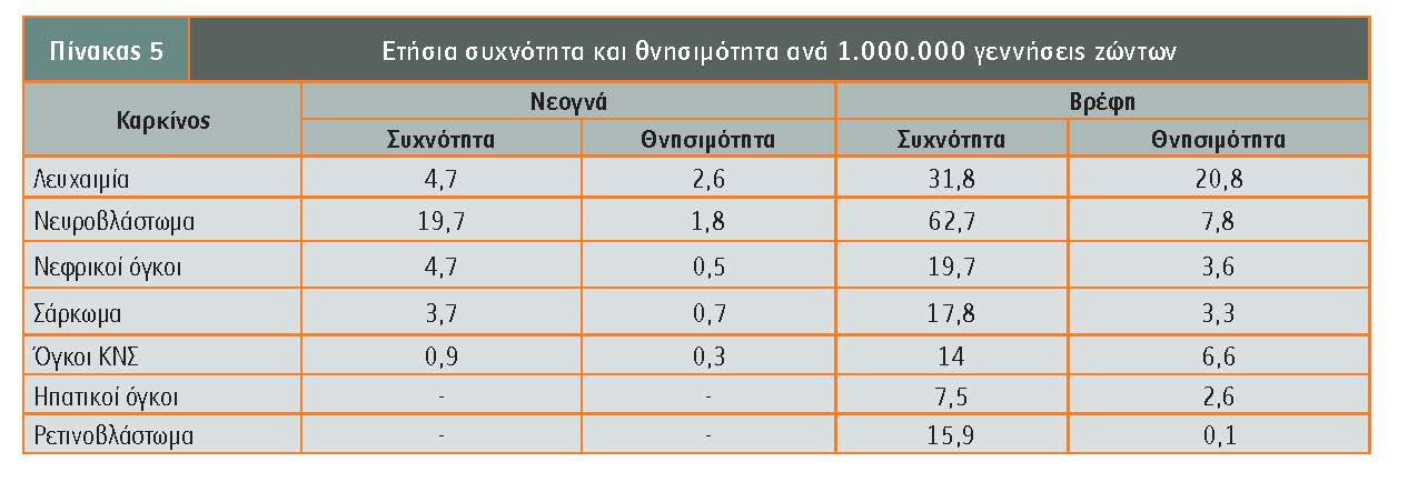 Στον πίνακα 5 παρουσιάζεται η ετήσια συχνότητα και θνησιμότητα από καρκίνο ανά 1.000.000 γεννήσεις ζώντων (Βασιλάτου-Κοσμίδη).