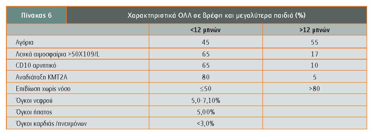 - Βρεφική λευχαιμία: H βρεφική λευχαιμία (διάγνωση μετά τον πρώτο μήνα και έως τον 12ο μήνα της ζωής) είναι επίσης σπάνια, με επίπτωση 41 ανά 1.000.000 βρέφη. Η συχνότητα της οξείας λεμφοβλαστικής λευχαιμίας (ΟΛΛ) στα βρέφη είναι μικρότερη από εκείνη σε παιδιά 1-14 χρόνων και ίση με εκείνη σε εφήβους, η λευχαιμία είναι συχνότερα Β προέλευσης και προσβάλλει περισσότερο κορίτσια, ενώ η συχνότητα της οξείας μυελογενούς λευχαιμίας στα βρέφη είναι διπλάσια από τη συχνότητα σε μεγαλύτερα παιδιά και εφήβους Στα βρέφη με ΟΛΛ η παρουσία χρωμοσωμικών μεταθέσεων μεταξύ του γονιδίου ΚΜΤ2Α στη θέση 11q23 (προηγούμενη ονομασία MLL -mixed lineage leukemia) και άλλων γονιδίων, μεταξύ των οποίων το συχνότερο (περίπου 50%) είναι το ΑFF1 (προηγούμενη ονομασία AF4), είναι συχνή (70%-80%) σε αντίθεση με τα μεγαλύτερα παιδιά, στα οποία η αναδιάταξη του γονιδίου ΚΜΤ2Α είναι μόλις 5%). Ηλικία <6 μηνών (σε αμερικανικά πρωτόκολλα <3 μηνών), αριθμός λευκών αιμοσφαιρίων >300.000 και αναδιάταξη του γονιδίου ΚΜΤ2Α-r έχουν ακόμη χειρότερη πρόγνωση (Brown). Μελέτη των νεογνικών καρτών Guthrie έχει δείξει την παρουσία συγχώνευσης γονιδίων όπως το ETV6/RUNX1 (παλαιά ονομασία ΤΕL/AML1) ήδη κατά τη γέννηση, χωρίς απαραίτητα τα νεογνά αυτά να εμφανίσουν στο μέλλον λευχαιμία, σε αντίθεση με τη συγχώνευση του γονιδίου ΚΜΤ2Α π.χ. με το ΑFF1, που οδηγεί σε σχετικά σύντομο χρόνο σε ανάπτυξη βρεφικής ΟΛΛ (Greaves). Όπως και στη συγγενή λευχαιμία και παρά τον σχεδιασμό και χρησιμοποίηση πρωτοκόλλων χρησιμοποιούμενων στη βρεφική ηλικία, η πρόγνωση εξακολουθεί να υπολείπεται από εκείνη της ΟΛΛ σε μεγαλύτερα παιδιά. Επίσης ανοσοφαινοτυπικά πρόκειται για άωρη ΟΛΛ συχνά CD10 αρνητική, σε αντίθεση με τα μεγαλύτερα παιδιά. Στον πίνακα 6 αναφέρονται τα χαρακτηριστικά και οι διαφορές της ΟΛΛ σε βρέφη και μεγαλύτερα παιδιά (Kosmidis).