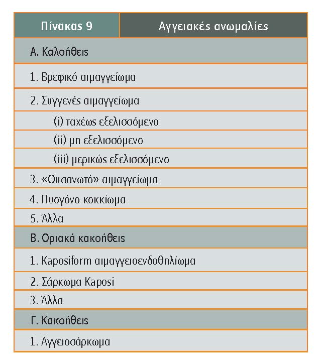 H Διεθνής Εταιρεία Μελέτης των Αγγειακών Ανωμαλιών (International Society for Study of Vascular Anomalies (ISSVA) κατατάσσει τις αγγειακές ανωμαλίες σε 3 ομάδες: καλοήθεις, οριακά κακοήθεις και κακοήθεις (πίνακας 9). Στα νεογνά και στα βρέφη συνήθως διαπιστώνονται καλοήθεις ανωμαλίες (Wildgruber).