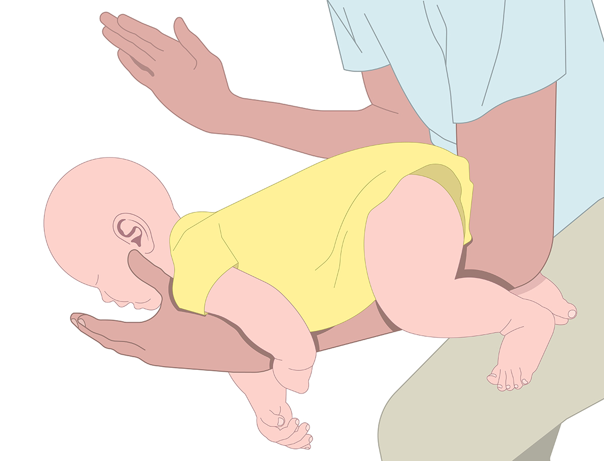 Τη στιγμή που έγινε η εισρόφηση, μπορούμε να ανοίξουμε το στόμα του παιδιού και μόνο στη περίπτωση που βλέπουμε κάποιο ξένο σώμα μεγάλο και ορατό, να προσπαθήσουμε να το τραβήξουμε. Απαγορεύεται να κάνουμε χειρισμούς στα τυφλά με το δάκτυλο, διότι υπάρχει μεγάλος κίνδυνος να σπρώξουμε το ξένο σώμα στο λάρυγγα, με ολέθριες για το παιδί συνέπειες. Εάν το παιδί είναι μελανιασμένο, δεν αναπνέει, το κρατάμε μπρούμητα με το κεφάλι προς τα κάτω, πάνω στο αντιβράχιό μας κρατώντας με τα δάκτυλά μας ανοικτό το στόμα, κτυπάμε το παιδί ανάμεσα στις ωμοπλάτες και παράλληλα καλούμε ασθενοφόρο με εξειδικευμένο νοσηλευτή. Εικόνα 1.